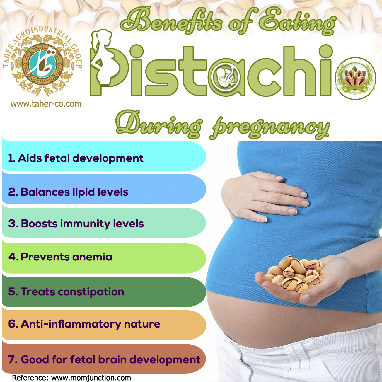 The nutrients present in pistachios are beneficial during pregnancy and aid in the healthy development of the baby. The nutritional benefits include: