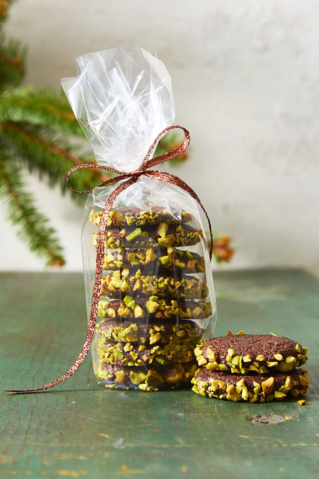 Divide dough in half; using plastic wrap to guide, roll into 2 logs, about 8 inches long and 11⁄2 inch in diameter. Roll in pistachios to evenly coat, then wrap in plastic wrap. Refrigerate until firm, at least 1 hour.